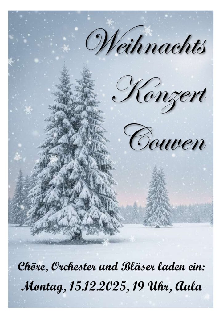 Am Montag, den 15. Dezember 2025, lädt das Couven Gymnasium herzlich zum diesjährigen Weihnachtskonzert ein. Ab 19:00 Uhr erwartet die Besucherinnen und Besucher in der Aula des Couven-Gymnasiums ein festlicher