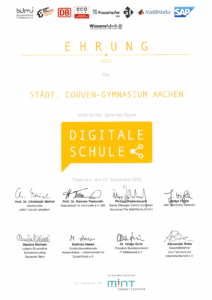 Im Rahmen einer landesweiten Ehrungsveranstaltung im Heinz Nixdorf MuseumsForum in Paderborn wurde das Couven Gymnasium im September 2025 erstmals als „Digitale Schule“ ausgezeichnet. Diese Auszeichnung würdigt Schulen, die sich durch eine strukturierte und nachhaltige Umsetzung digitaler Bildung hervortun – sowohl im pädagogischen Konzept als auch in der konkreten Unterrichtspraxis.