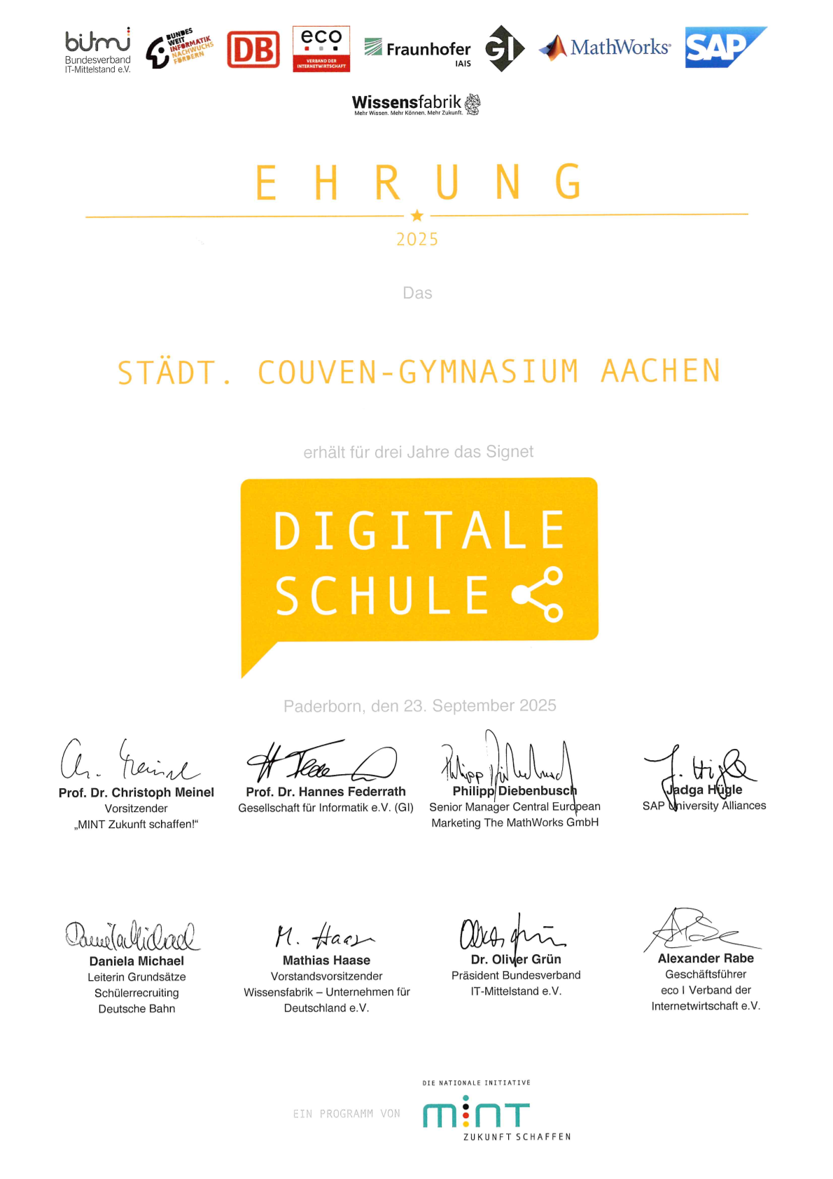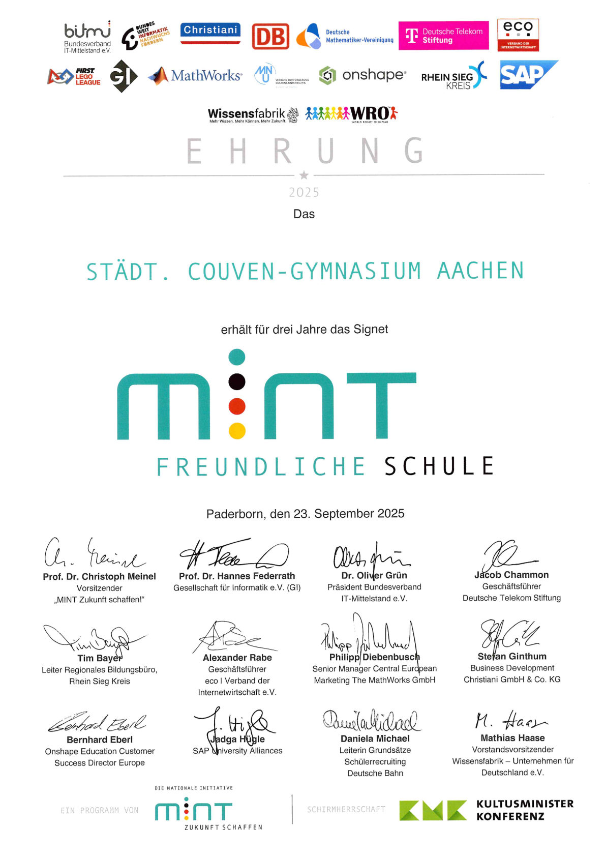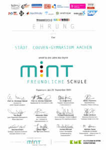 Neben der Auszeichnung als „Digitale Schule“ wurde das Couven Gymnasium auch erneut als „MINT-freundliche Schule“ geehrt. Diese zweite Auszeichnung knüpft an frühere Ehrungen an und würdigt die konsequente Förderung der Fächer Mathematik, Informatik, Naturwissenschaften und Technik am Couven.