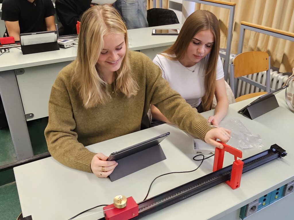 Besonders sichtbar wird die neue Ausstattung im aktuellen EF-Jahrgang. Hier haben die Lernenden Bewegungen, Kräfte und Beschleunigungen mithilfe digitaler Sensoren selbst erfasst und direkt auf dem iPad ausgewertet. Neben klassischen Experimenten mit der Stopuhr oder der Auswertung von Videos mittels Videoanalysesoftware konnten sie nun beobachten, wie ihre eigenen Versuche in Echtzeit als Messwerte und Diagramme erscheinen. Schon nach wenigen Stunden zeigte sich, wie stark die Schülerinnen und Schüler von dieser Arbeitsweise profitieren. Viele formulierten, dass man „die Zusammenhänge viel besser versteht, wenn man sie selbst misst“. Mehrere Rückmeldungen betonten außerdem, dass man „sich viel aktiver mit dem Experiment beschäftigt“.